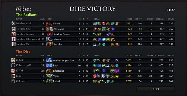 Yet another teamfight at iG's bottom tier 2 saw a two-for-two trade with a Viper buyback, with NewBee successfully taking the tower. A teamfight initiated by Puck saw a 4 for 3 exchange, with iG coming out even further ahead by forcing a Mirana buyback. A mistake by Batrider trying to contest iG taking Roshan saw him waste Lasso on Puck's Aegis, causing his death and a free Roshan for iG. iG immediately pushed into mid, taking out Mirana, Doom and Shadow Demon. Without the Mirana buyback, iG were able to push through NewBee and force the GG by taking out the throne.