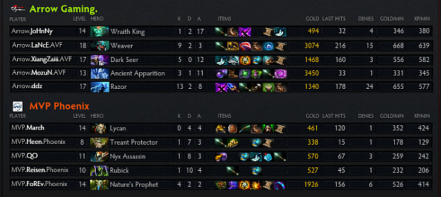 Arrow Gaming went on an aggressive tri-lane to try shut down Lycan. They managed to claim first blood, with the combination of Ancient Apparition, Weaver, and Wraith King dominating the top lane. That gave Weaver the opportunity to farm and get an early Linken's Sphere. MVP switched lanes, sending their Lycan to the bottom lane to replace Nature's Prophet. The Malaysian team also dominated the mid and bottom towers with Razor getting kills against Nyx Assassin and Dark Seer pressuring the bottom lane with his Ion Shell.