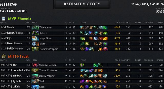 Draft - The teams went with familiar heroes, both retaining 3/5 heroes from their game 1 line-up. This time, Trust went with a Slark and a Death Prophet while MVP picked a Naga and a Tidehunter. 1:00 - The duo of Shadow Demon and Tidehunter were again instrumental in taking first blood, taking down the Rubick in the latter's jungle 3:00 - Trust took the second kill of the game as their aggressive trilane dived Jakiro. MVP was forced to adjust, and they sent Jakiro top and Nature's Prophet to the jungle. 10:00 - MiTH claimed the middle tier-one tower, their second of the game. They were ahead 5-3 in kills and 4,000 in gold.