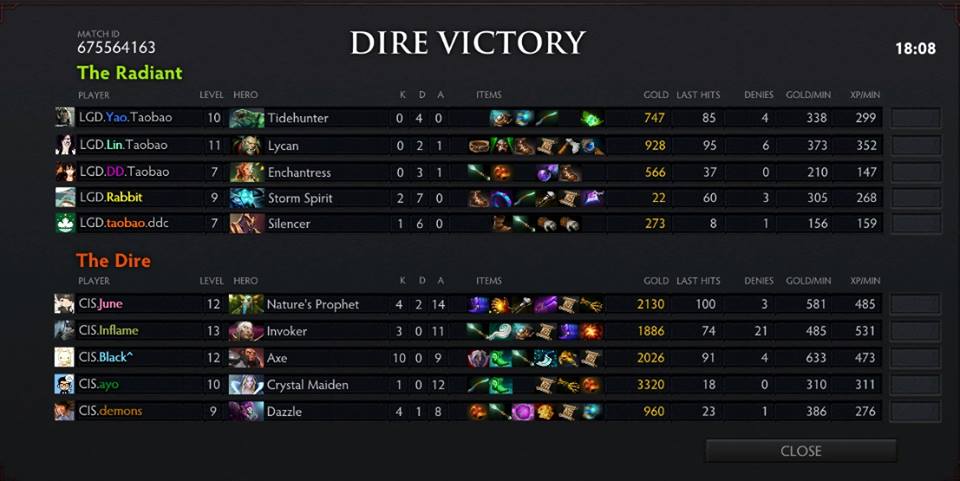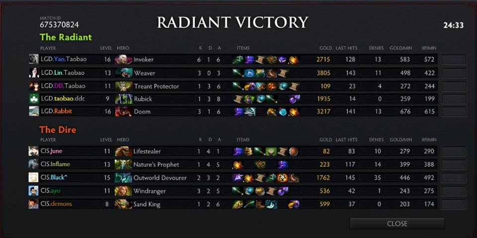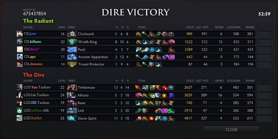 But LGD was still at an advantage with their team getting more kills with no or few exchange kills for CIS. LGD destroyed the mid tier towers and barracks. After killing Roshan, LGD proceed on the bottom lane and destroyed the barracks as well. CIS called 'gg' on the 52-mminute mark after they lost a team fight on top lane.
