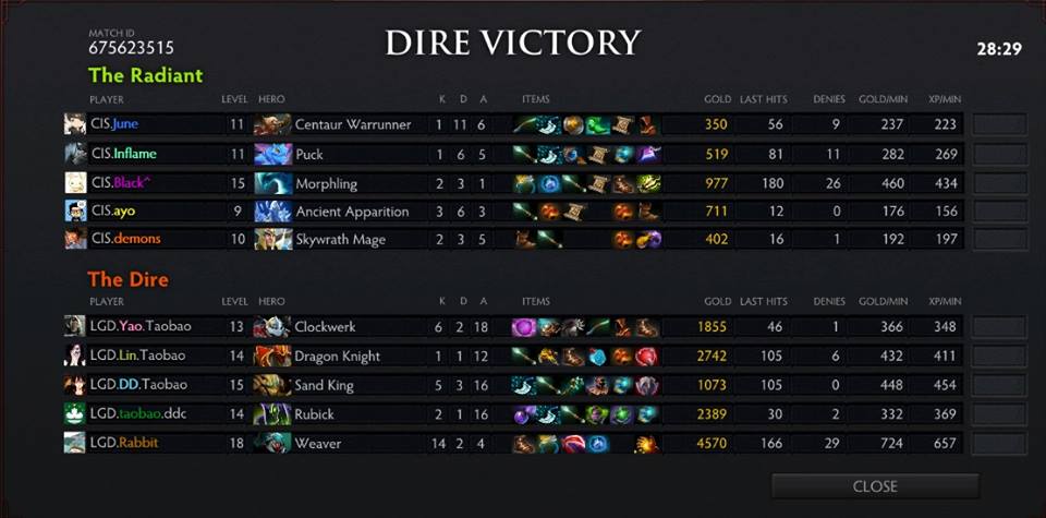 LGD had a few attempts to kill and shut down Morphling in midlane but they were unable to do so. But LGD continued to overpower CIS and having Dragon Knight in LGD's lineup was also helpful in pushing towers. They were able to destroy CIS's top tier 1 during during the 7-minute mark. CIS, in return, was able to destroy LGD's top and mid tier 1 tower but it wasn't enough for a turn around. Roshan was claimed by LGD and they continued to push for barracks. CIS called 'gg' before the 30-minute mark.