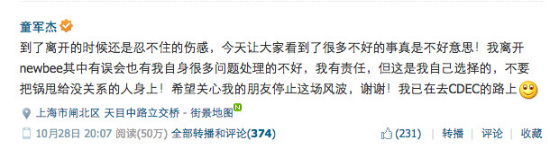 "I cannot help but feel sad when leaving Newbee. I am very sorry to have to announce this bad news to everyone today! I left Newbee due to a misunderstanding. I take some responsibility for this misunderstanding as there were many problems which I did not address properly. I chose to leave Newbee, so do not push the blame onto anyone! I hope all my friends and fans who care for me will stop the drama caused by my departure, thanks! I am on way way to CDEC now :)." - Mikasa's Weibo statement on him leaving Newbee.