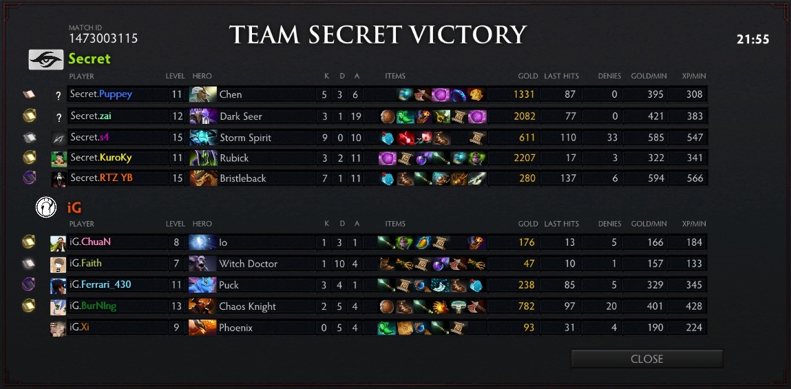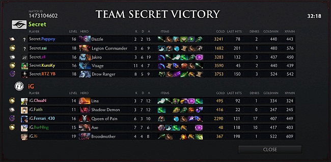 Secret subsequently mounted up an attack on the bottom lane and obliterated the barracks. As Secret was making their move onto the tier four towers, iG defended the best they can but a few clutch Shallow Graves from the Shadow Priest were able to keep the Drow Ranger and the Legion Commander alive to deal significant damage to iG's cores. iG tapped out as their Queen of Pain died for the second time.