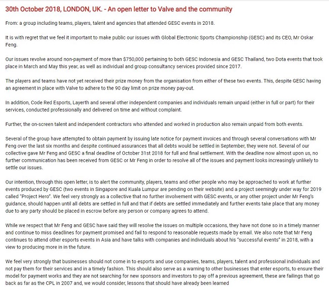 In an open letter penned by members of the Dota 2 professional scene "issues revolve around non-payment of more than $750,000 pertaining to both GESC Indonesia and GESC Thailand, two Dota events that took place in March and May this year, as well as individual and group consultancy services provided since 2017."