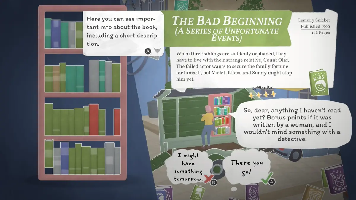 Using real-world knowledge to put two-and-two together and solve these mini-puzzles is particularly satisfying, because every so often, you’re going to stumble upon a book you’ve already read and know if it’d work as a recommendation instinctually. There’s also the enduring novelty of simply spotting your favourite book on the shelf and going “Hey, I’ve read that one!” It feels almost like an Easter egg hunt at times. My greatest in-game find was A Series of Unfortunate Events: A Bad Beginning, an all-time favourite of mine. I have yet to meet someone in real life who grew up reading those books, but apparently, someone at Neoludic Games is fond of them too.
