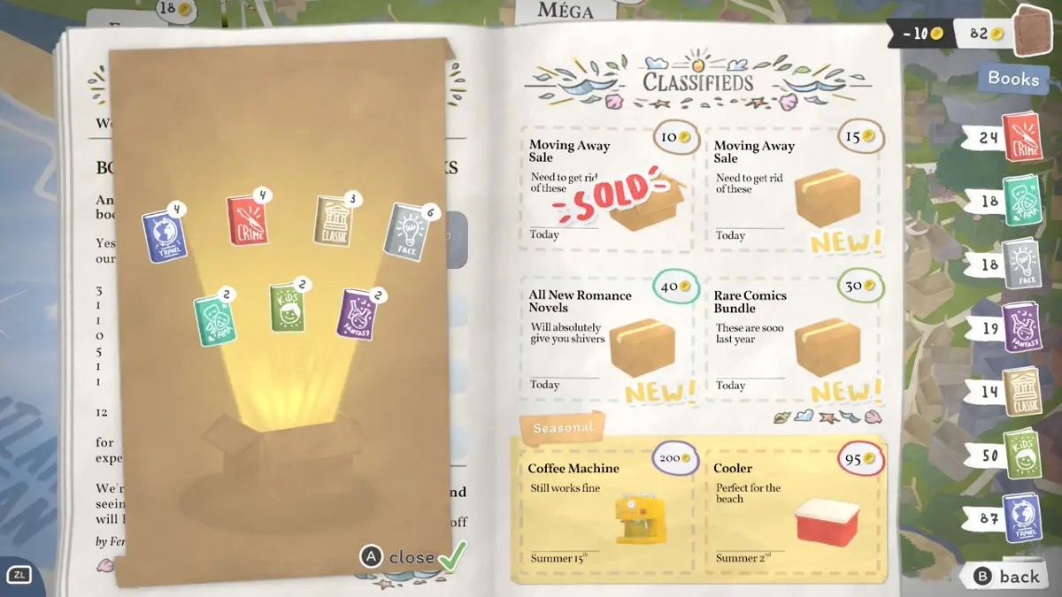 As someone who has one too many books myself, managing the bookshop was a real treat. Tiny Bookshop uses real-life books, authors, and story summaries to stock up the shelves of its bookseller. Although the player can’t choose the exact books they get to sell to customers, they can choose the number of books they want to stock up per genre. For example, out of 40 books in total, they'll have to pick how many of those are Crime, Kids, Thriller, History, Fact, or Travel novels. Different genres sell differently, so the ration has to be exactly right.