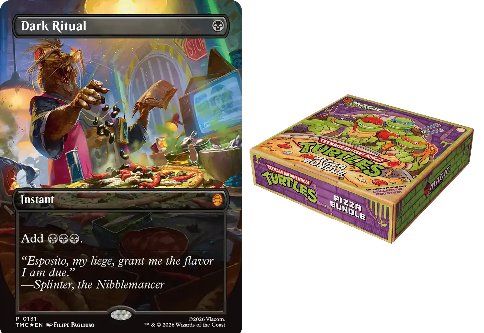 The last new treatment will only involve six cards from Magic: The Gathering’s history (only Dark Ritual was revealed so far), and these six cards will feature pizza-themed artwork! These cards will only be available in an all new Pizza Bundle, and be warned: these new Bundles absolutely look like actual pizza boxes, so don’t be fooled into thinking there are actual pepperoni slices in there!