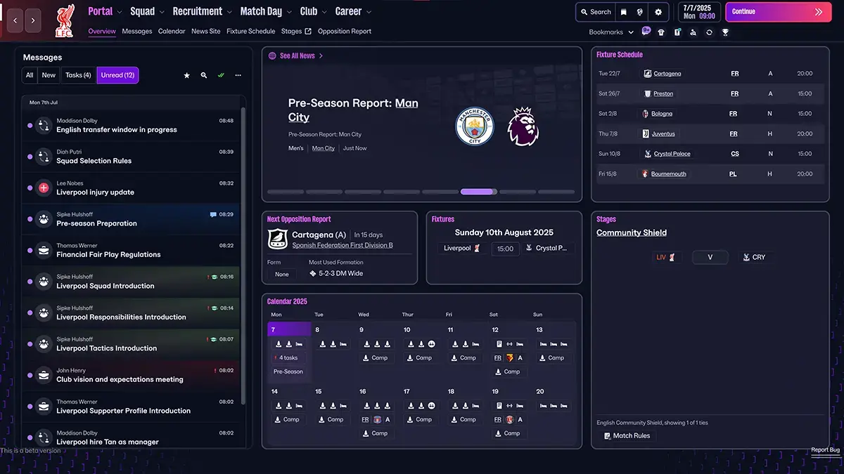 At first glance, Football Manager 26 looks very different the moment you’ve successfully created your manager and picked a club. The user interface has changed significantly: the traditional navigation sidebars are gone, and everything is now in cards and tiles.