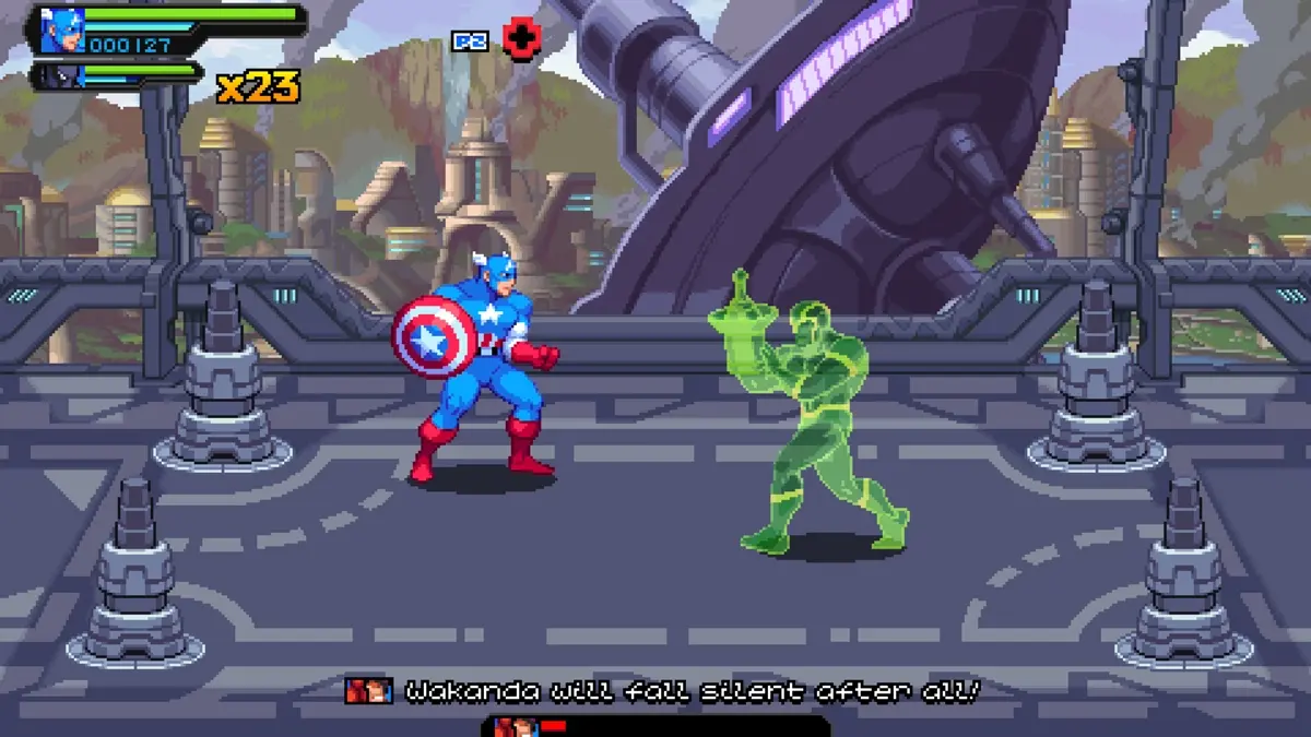 Marvel Cosmic Invasion is a side-scrolling 2D brawler, though a few of its levels tend to also throw in unexpected environmental changes that might force you to mix things up. For example, a brief sojourn to Birnin Zana might suddenly turn into a bare-knuckle slugfest atop a moving train, complete with stage hazards and flying enemies. The game throws in these little twists and turns at a satisfying rhythm, keeping the campaign from getting stale.