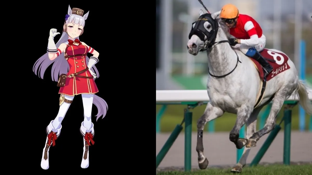 Gold Ship in Umamusume: Pretty Derby (left) and real life (right) (Images: Cygames, JBIS Search).