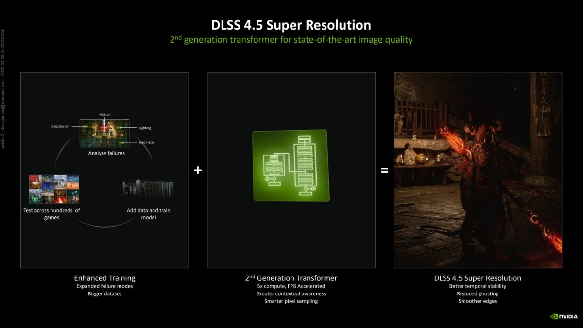 The second-generation transformer model also replaces older convolutional neural network (CNN) approaches previously used by DLSS. According to NVIDIA, transformer models are better at analysing fine detail and motion-heavy scenes, allowing the AI to focus computing power where it is most needed. This is intended to improve temporal stability and overall image quality across supported games.