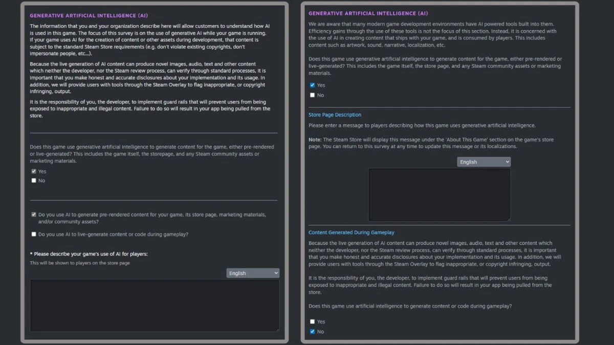 Despite the softer tone around internal tooling, Valve is not backing away from disclosure entirely. Developers publishing their games on Steam must still answer a clear yes or no to the question: “Does this game use generative artificial intelligence to generate content for the game, either pre-rendered or live-generated? This includes the game itself, the store page, and any Steam community assets or marketing materials.”