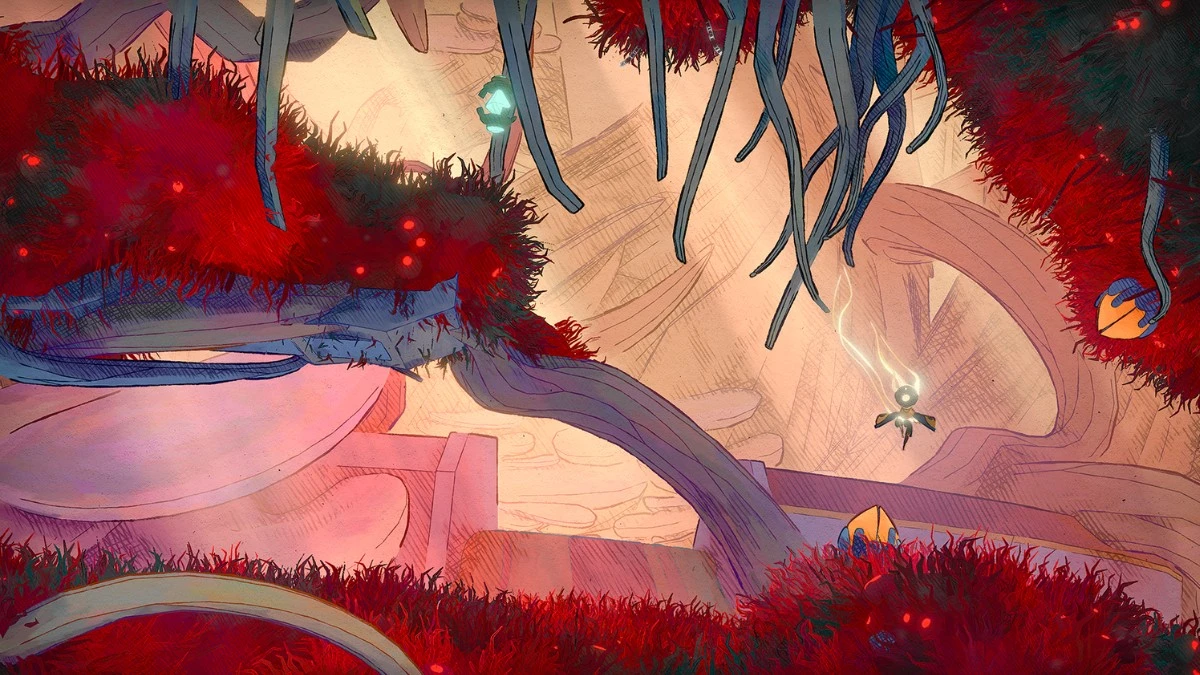 But as you explore further, new areas start to unfold in bursts of colour and style. Each world is distinct, yet tied together in a cohesive artstyle that makes the whole vessel feel like a moving painting. The use of light and shadow is particularly effective, reminding me of Ori and the Blind Forest: darkness isn’t just darkness: it always has a purpose, and bright, colourful areas can be full of suspicion. Not everything that looks inviting is safe, and the only way to learn the truth is to interact with it.