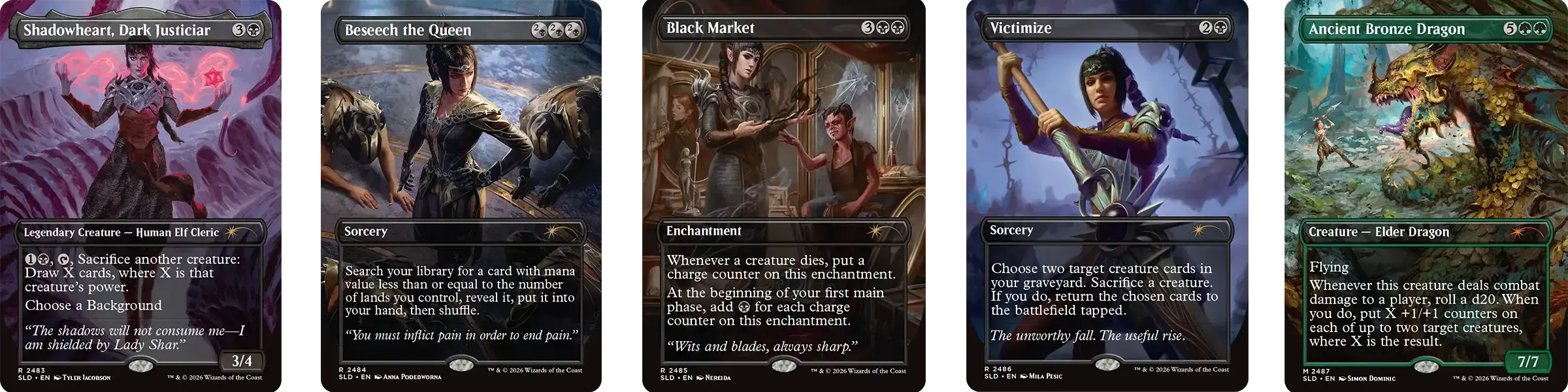 Shadowheart, The Dark Justiciar gets a full art reprint after first appearing in Commander Legends: Battle for Baldur's Gate. God's favourite princess will also appear in new art for the following cards: Beseech the Queen, Black Market, Victimize, and Ancient Bronze Dragon.
