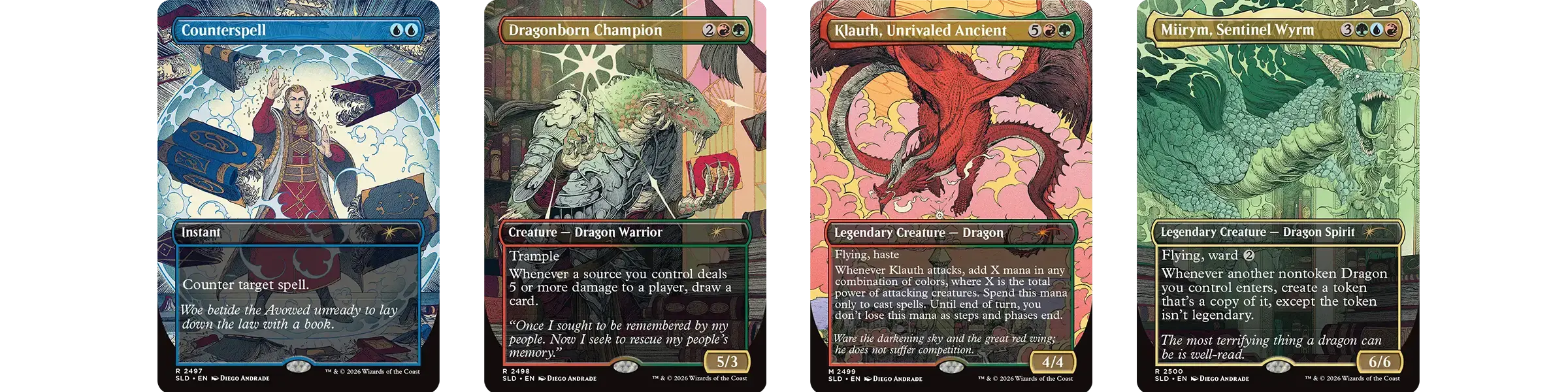 This drop features the following cards in new art: Counterspell, Dragonborn Champion, Klauth, Unrivaled Ancient, as well as Miirym, Sentinel Wyrm.