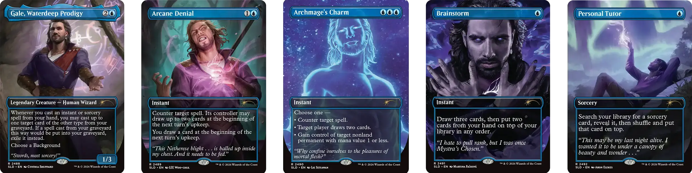 Gale, Waterdeep Prodigy also gets a full art reprint after first appearing in Commander Legends: Battle for Baldur's Gate. Gale will also appear in new art for the following cards (which actually would be decent inclusions for a Commander deck with Gale, Waterdeep Prodigy as its Commander): Arcane Denial, Archmage's Charm, Brainstorm, and Personal Tutor.