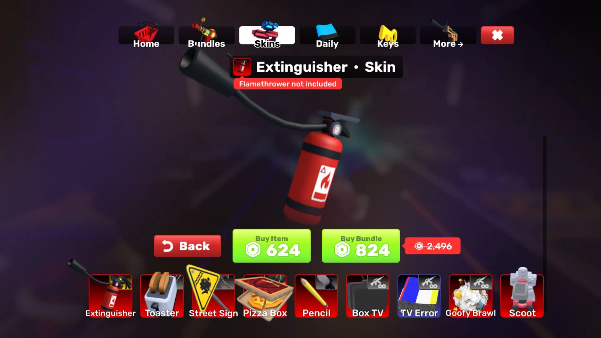 In the bundle, you can find the “Fire Extinguisher” Flamethrower, “Toaster” Dagger, “Street Sign” Battle Axe, and “Pencil Knife” skins. Players can also obtain a “Box TV” charm, a “TV Error” wrap, a “Goofy Brawl” finisher, and a “Scoot” emote.