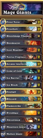 The Mage Giants control will often win the game by T9. He will often allow the opponent to reduce him to little life, sneak in an Ice Block and play two giants on T8, followed by a board-freeze. A T9 dragoness will reduce the opponent to 15 health and an attack from the two 8/8 giants will finish him off.