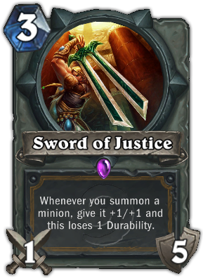 A staple for all aggro Paladins, [card]Sword of Justice[/card] makes every minion drop all the more powerful. As long as it doesn't get destroyed, even just using the hero power Reinforce grants you solid board presence with a 2/2 soldier in play every turn. With a cost of 3, it fits perfectly to the deck, especially since the Paladin doesn't have many options by third turn.