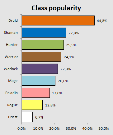 What we hoped to be a close race in popularity went dramatically into Druid’s favor instead. Used in 44,3% of all matches, Malfurion is the uncontested prom king, followed by Thrall the Shaman at 27,0%.