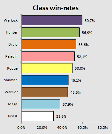 Win-rate-wise, Warlock is at the very top, pushing 60%, followed by Hunter at 57% and Druid at 53,6%.