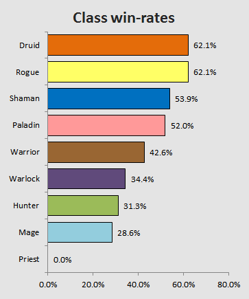 That is still infinitively better than the outings Priest had throughout this first cycle. The class was rarely touched as it is, but when it was played, the results were always against Anduin. The light only burned whoever tried to play this class, although that might come down to some players trying out funky tactics with [card]Gelbin Mekkatorque[/card] in a Priest deck. Whatever it is, the Priest class has hit rock bottom being played only eight time - eight times throwing in the towel at that.