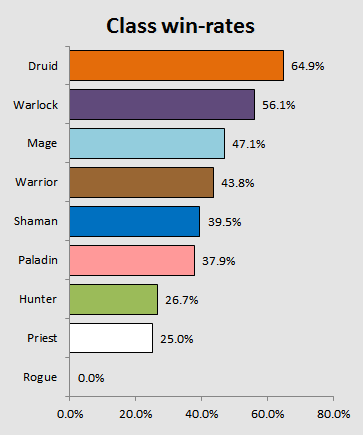 All the other classes are sitting just shy of the "break even" point in 50%. Especially for Mage this might be a huge triumph, since the class was rarely used and had one of the worst track records back in Cycle 1. The vindication of Ms. Proudmore and her avid lovers has come full circle now, as she could score a decent amount of victories in the limited playing time she received. It's nothing ground-breaking or hail worthy, but a nice boost in one of the classes that is not seen all too much from people outside of Trump.