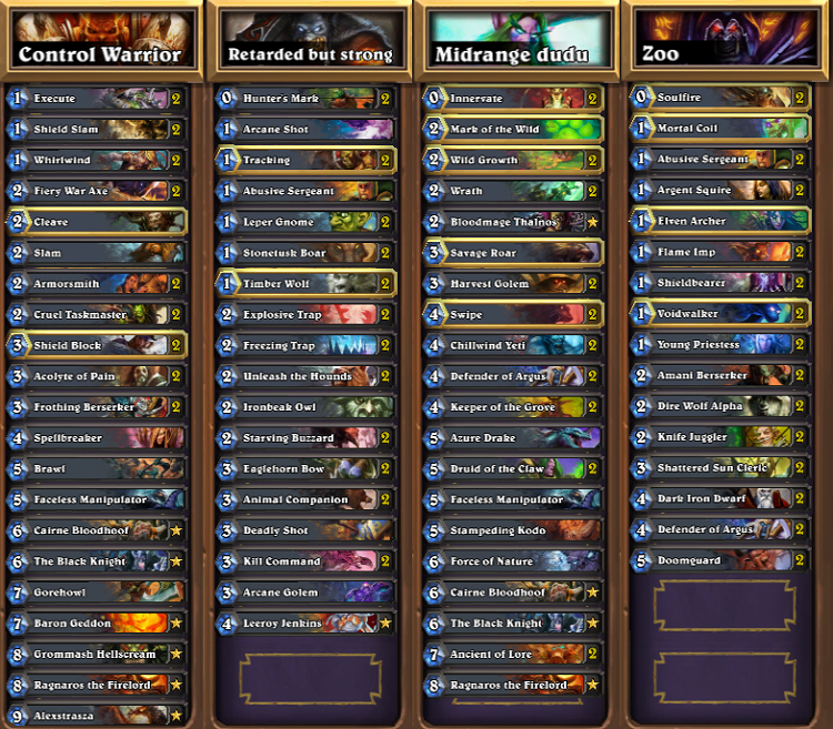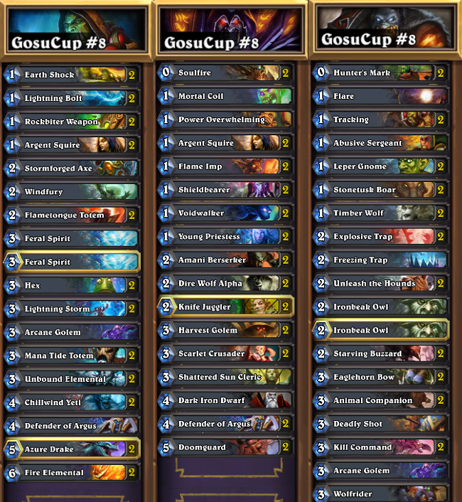 With GosuCup going on a budget this week, we expected to see Hunter and Zoo being used a lot and so it was. Winner Lalah went for a very standard Warlock build alongside a rush Hunter (as compared to the Savannah Highmane builds) and threw in just a pinch of Shaman in case something goes wrong.