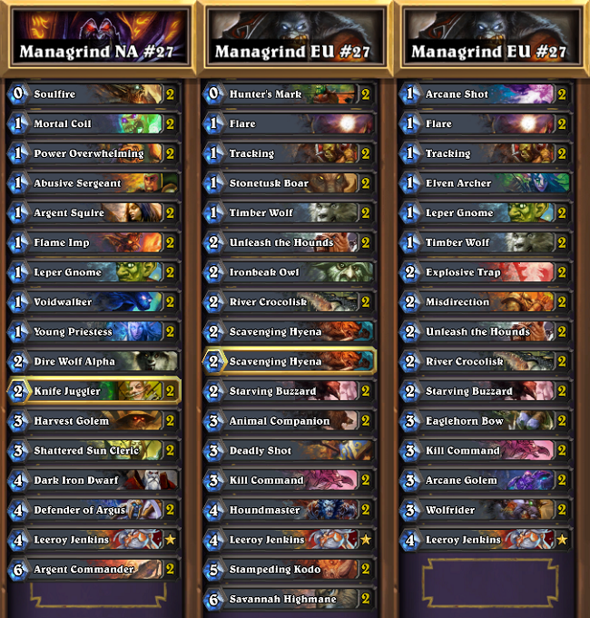 Believe it or not, the weekend Managrind tournaments are not rarity-restricted but bar the Leeroys here and there, there isn't really a big difference to our budget GosuCups. Combined, NA and EU repeated what everyone already knows - Zoo is strong and so is Hunter.