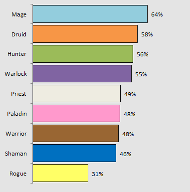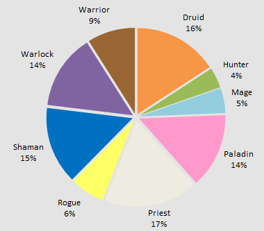 During our day one analysis, we glimpsed at the class represented in players' line-ups and saw that Warlock was the popularity king, followed by Druid, Priest and Paladin. When it comes to actual games played, however, things stand a bit differently.