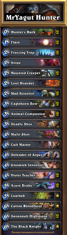 MrYagut's build is very reminiscent of old-school closed beta control Hunters which used weapons and direct removal to live till their finishers, usually a combination of the old Unleash the Hounds (giving all beasts +1/+0 and Charge), [card]Timber Wolf[/card] and [card]Young Dragonhawk[/card] for an OTK burst. MrYagut doesn't use that for obvious reasons, instead going for the standard line-up of finishers like [card]Savannah Highmane[/card] and [card]Cairne Bloodhoof[/card]. He also runs the ubiquitous [card]Hunter's Mark[/card], [card]Flare[/card], [card]Freezing Trap[/card], [card]Animal Companion[/card] and [card]Mad Scientist[/card] but this is where the standard ends.