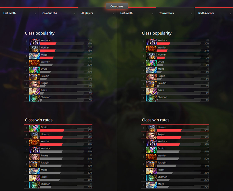 Comparing the win-rates is a lot more interesting. The only class the three regions share in the top 3 is Hunter, otherwise they’re completely different. The two graphs below display three completely different preferences. In last month, SEA’s victories have been brought by Druids, Hunters and Warriors. In North America, the three best classes are Hunter, Rogue and Warlock, while in Europe it’s Mage, Paladin and Hunter. Those are seven different classes with high win-rates, clearly displaying the unique favoritism the three scenes display.