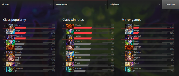 GosuCup SEA is one of the biggest open tournaments for the Southeast Asian region. Hundreds of players sign up to play each Saturday and as a result these events become rich sources of data. Although the GosuCups do not force players to choose several decks and stick to them, competitors do go through a pick phase to choose three classes for each series and then play it out in a Conquest format.