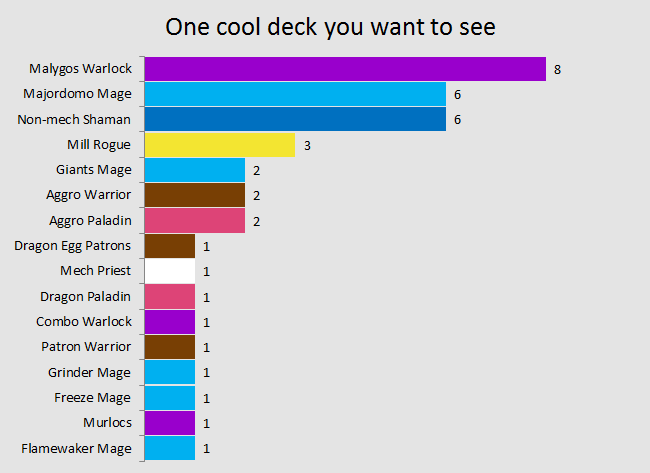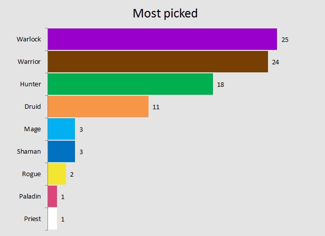 The one thing that vouches for the strength of these three classes is that players seem to think that when they’re not banned, they’ll get immediately snatched. Their answers are also in congruence with what the data collected from tournament games in the last month shows. Said data also puts Druid and Mage as the classes filling up the top 5, which is exactly what the prediction graph shows. Shaman is also there, tied with Mage, so there’s hope for Thrall still.