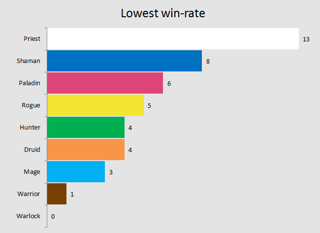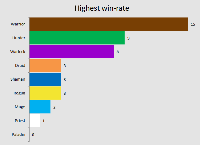Moving on to the winners and losers of the current metagame and, what a shocker, the “Power 3” of Warrior, Hunter and Warlock are still on the top of the highest win-rate graph. The difference between them and the rest of the classes is significant: At #3, Warlock is whole five votes ahead of the tied for #4 Druid, Shaman and Rogue.