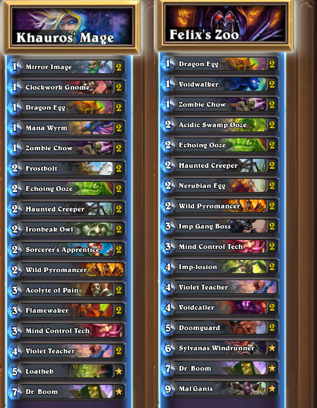 I thought after Mage was banned, that Warlock Zoo was the obvious best deck because of cards like [card]Imp Gang Boss[/card] and [card]Doomguard[/card]. I expected a lot of Warlocks. In my first two rounds I played two [card]Sacrificial Pact[/card]s, because I played against Warlocks.