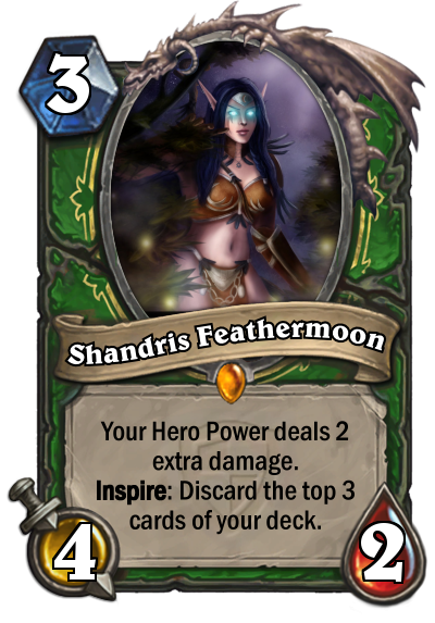 Secondly, we have the wet dream of Face Hunters, Shandris Feathermoon. Shandris is a 4/2 minion for 3 mana which doubles the damage of your hero power, but you have to pay for it with the top 3 cards of your deck. It has a very [card]Fel Reaver[/card]-y effect to it but it is you who controls when the drawback happens. That is, if Shandris ever survives more than one turn ...