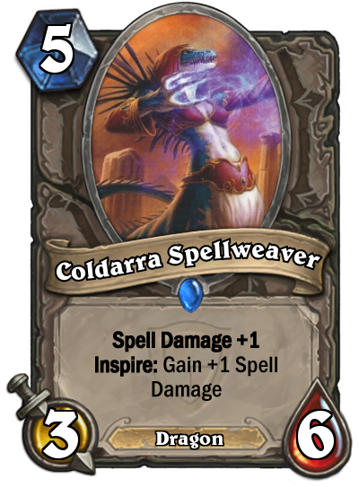 Coldarra Spellweaver is a high-health 3/6 minion for 5 mana coming with Spell Damage +1. Besides that, she gets +1 more Spell Damage on each Inspire. The word "Coldarra" in the name is there for a reason. Imagine a set-up with Spellweaver and [card]Coldarra Drake[/card] and maybe even [card]Maiden of the Lake[/card], essentially turning the Spellweaver into a mid-range [card]Malygos[/card] and killing your opponent with something as cheap as Frostbolt.