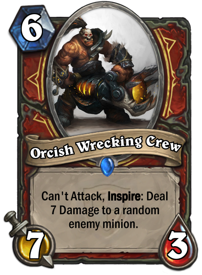 Finally, we have the Orcish Wrecking Crew, a mini [card]Ragnaros the Firelord[/card] for Warrior. The Crew can't attack, is a 7/3 minion for 6 mana and deals 7 damage to a random enemy minion. Place it behind a taunt and wreck faces for days.