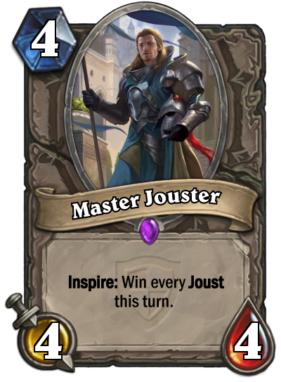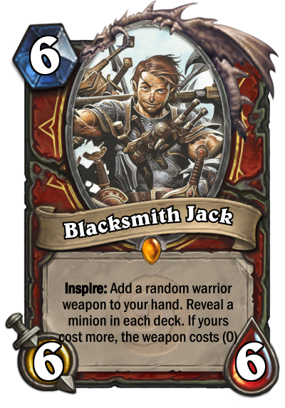 On the left, we have Blacksmith Jack, one of the few cards we received that combines both effects. Jack adds a random Warrior weapon to your hand on Inspire and then triggers a Joust. If the Joust is won, that weapon costs (0). And that's the effect that makes this card brutal. Warriors - especially control ones - are known to run high-mana minions, so winning the Joust is very likely. Add to this the fact that most Warrior weapons are expensive, getting up to 7 mana reduction for a [card]Gorehowl[/card] sounds scary.