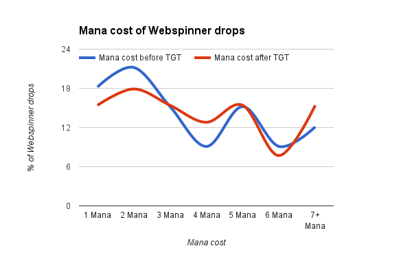 As you can see, quite a number of beasts you could get off of Webspinner prior to TGT were 1- and 2-drops - 39% of them to be precise. Once TGT hits, this number will go down significantly: only 33% of all collectible beasts will be early drops. On the other hand, the chance to get a 4-drop (from 9% up to 13%) or 7-drop or higher (from 12% up to 15%) will be rising quite a bit.