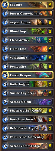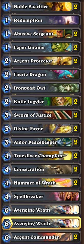 Morlu's Paladin is another aggro deck. Like Eldorian's Lock, this deck too fills the board early and distributes damage through Knife Juggler. Two sets of weapons come in to keep board control and buff up the creatures, Consecration, Hammer of Wrath and Aldor Peacekeeper further keep opponent's side in check and Avenging Wrath and Argent Commander serve as the end-of-the-curve finishers.