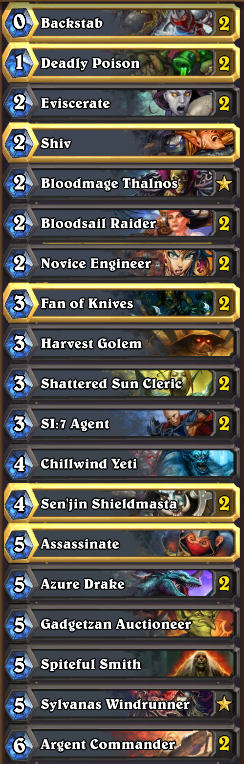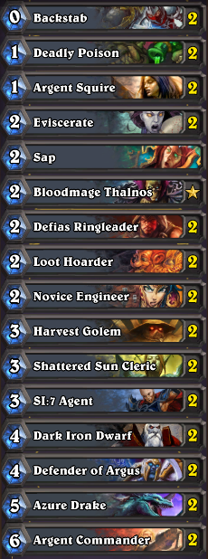 Realz's deck is another Rogue one, the uniqueness of which lies with the absence of Assassinate, the inclusion of Sap, additional draw options through Loot Hoarded and the set of Argent Squires who are not seen in that many Rogue decks.
