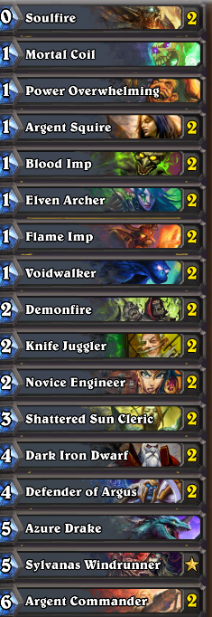 Look at the first place finisher and you'll see almost the exact same deck. The differences are small: Azure Drake is played instead of Venture Co. Mercenary, Sylvanas has replaced the Arcane Golem and a single copy of Mortal Coil is put instead of Faerie Dragon. According to deck's creator, Acidic Swamp Ooze, Shadowflame and Mortal Coil are sideboarded in when facing weapon decks, Paladins and mid-range aggro decks, respective.
