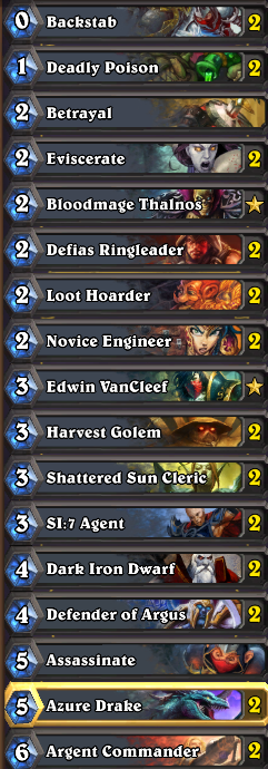 p0rn's second deck of choice is another standard one, this time an Edwin van Cleef Rogue. The playstyle is identical to that of the last Managrind Rogue high-finishers: establish a board with strong, cost-efficient creatures, keep opponent's board clean through Backstab, Eviscerate, Assassinate and Betrayal and beat him down gradually.