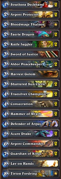 Judoki's 2nd place deck is a version of the standard Paladin aggro that opens the early-game strong with Knife Juggler, Faerie Dragon, Shattered Sun Cleric and Harvest Golem and also features different cards to control the board. The ubiquitous Consecration is supported by Hammer of Wrath to clear the board and Alder Peacekeeper to keep opponent's minions small (or dead). The mana curve goes all the way to 8 mana and utilizes late game cards such as Guardian of Kings and Lay on Hands to regain lost life and re-fill the hand as well as Tirion Fordring as the go-to finisher in Paladin decks.