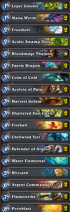 p0rn's first deck that he used during the EU mana grind is a standard aggro Mage. The deck opens with early game pressure through Leper Gnome, Mana Wyrm and Faerie Dragon, keeps the tempo through cheap removals and frost spells and finishes the opponent off with Pyroblast or Argent Commander.