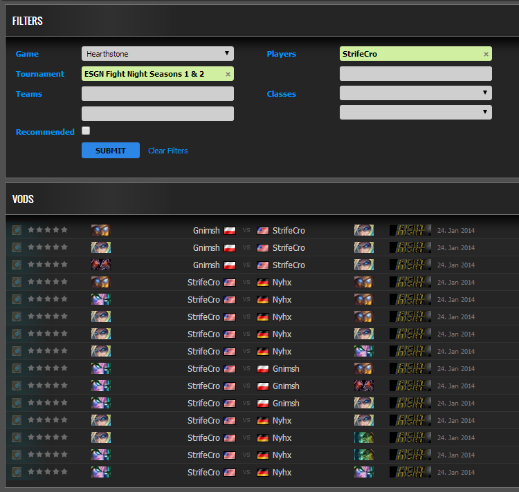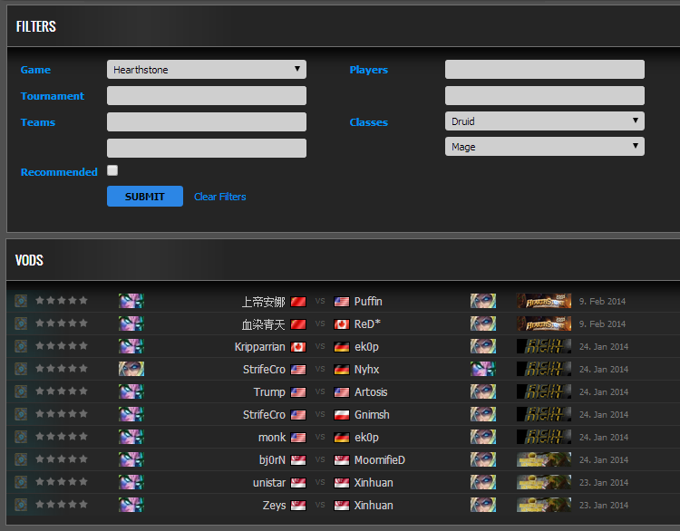 The filters on the top make for easy navigation and you can quickly find all the games from a specific tournament or featuring a particular class or a player. You can also search for multiple criteria at ones, like filtering out all games in one Class-vs-Class match-up, find where Artosis played Kripparrian last or search for all VODs of StrifeCro's Druid.