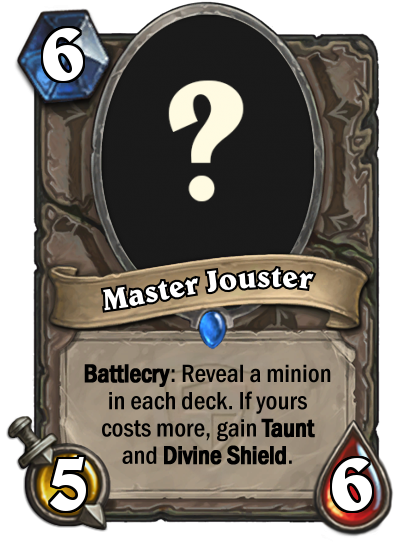 Another jousting minion, this time one that gains Taunt and Divine shield if your minion wins the joust. In all stats the Master Jouster is an upgraded [card]Annoy-o-Tron[/card]. 4 more attack, 4 more health and for 4 more mana. As said earlier, the minions that joust are to slow the game down. And although the jousting effect will have to be tried in many different decks in order to perfectionalize it, this card could very well become a viable 6 drop in many of them.