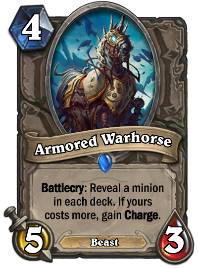 Whereas The Skeleton Knight might be the worst jousting card released today, the Armored Warhorse is a good second. It can best be compared with Kor’kron Elite, which costs the same and has guaranteed Charge. Granted, it has 1 less attack. However, 1 more attack and not even guaranteed Charge is a waste of your mana. Many 2, 3 and 4 drops challenge this minion, so it can be concluded that this card will see no play at all.